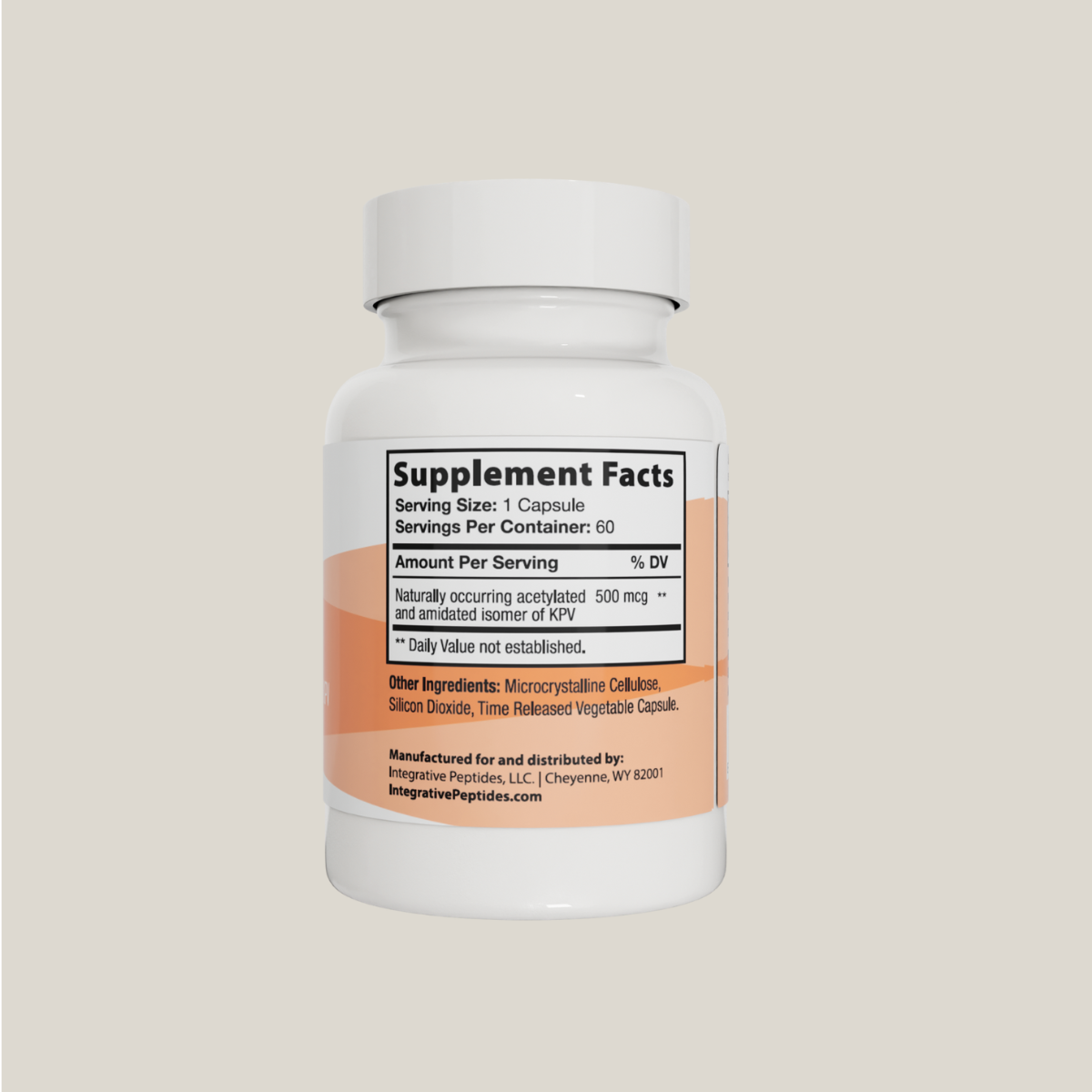 Naturally Occurring Acetylated and Amidated Isomer of KPV 500 mcg. Other Ingredients: Microcrystalline Cellulose, Silicon Dioxide, Time Released Vegetable Capsule.