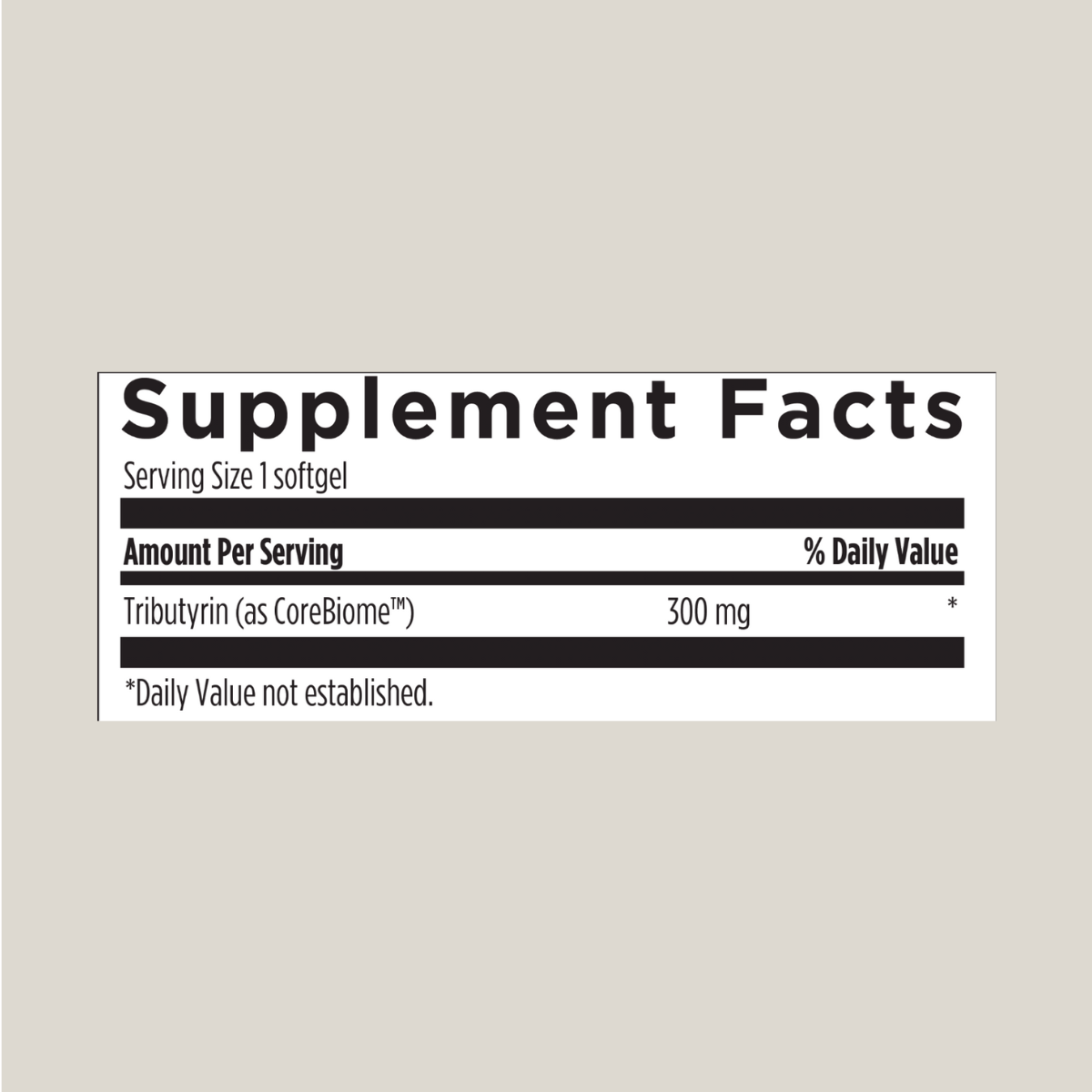Butyrate Plus represents a new approach to gut health and immune function by modulating intestinal flora, promoting colonocyte health, and supporting proper gut permeability. This product features CoreBiome™, a patent-pending form of tri-butyrin, consisting of three molecules of butyric acid (butyrate) bound to glycerol. Each softgel provides 300 mg of this novel, broad-application compound.