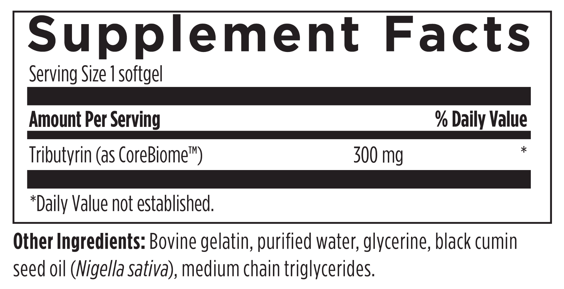 Butyrate Plus represents a new approach to gut health and immune function by modulating intestinal flora, promoting colonocyte health, and supporting proper gut permeability. This product features CoreBiome™, a patent-pending form of tri-butyrin, consisting of three molecules of butyric acid (butyrate) bound to glycerol. Each softgel provides 300 mg of this novel, broad-application compound.