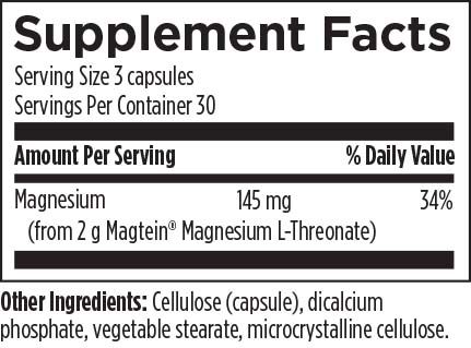 Cogni Mag Plus uses the unique, patented mineral Magtein — a magnesium chelated to threonic acid (magnesium L-threonate) — a highly bioavailable form that has the potential to cross the blood-brain barrier. This form of magnesium has been shown to be superior in repleting magnesium in the body compared with other forms. Research demonstrates that elevating brain magnesium content through supplementation with magnesium L-threonate may be a useful strategy to support cognitive abilities and healthy memory.