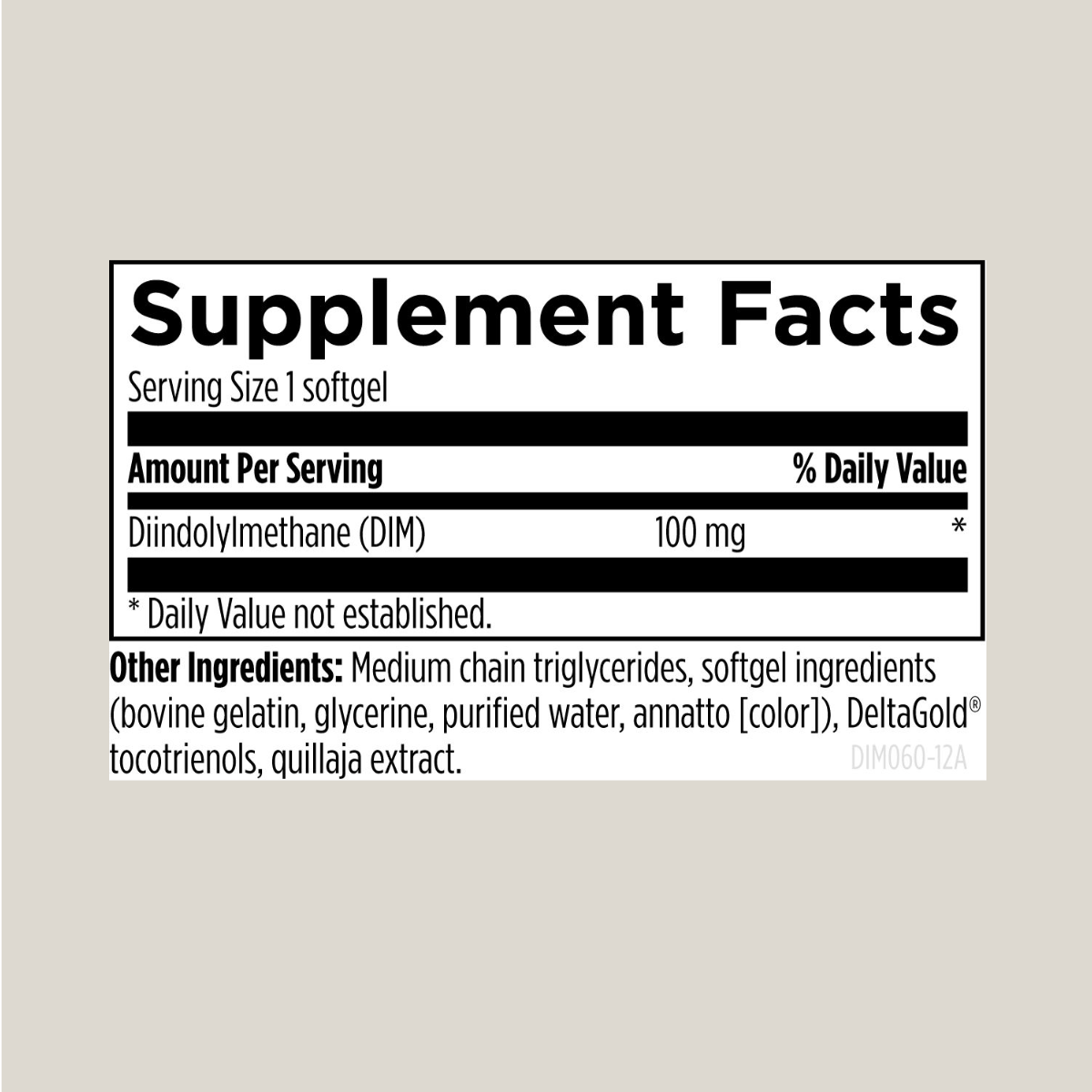 DIM-Evail™ provides 100 mg per softgel of diindolylmethane (DIM), a compound that helps support healthy estrogen metabolism. Due to its crystalline structure, absorption of DIM is minimal when given orally. For this reason, DIM-Evail™ has been manufactured utilizing the Designs for Health Evail™ process for enhanced nutrient absorption and bioavailability.
