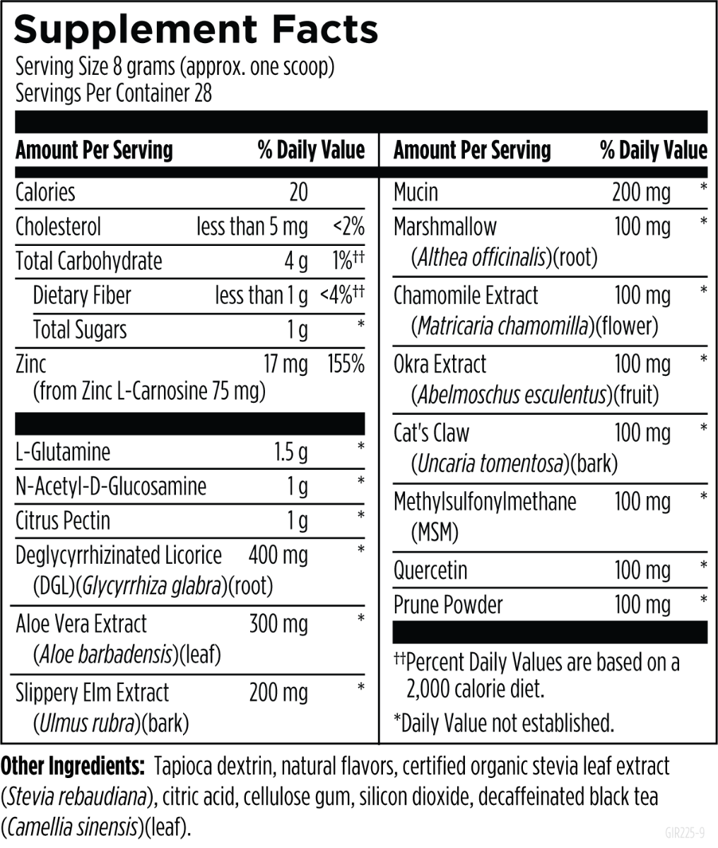 GI Fortify Plus is also provided in a convenient powdered form. It delivers targeted amounts of specific amino acids, botanical extracts, and minerals to offer comprehensive support for gastrointestinal (GI) health and function. The lining of the GI tract must be permeable enough for nutritional absorption, yet also provide a barrier against toxins, allergens, and certain microbes. The ingredients in this formula support healthy intestinal function by coating and soothing the GI lining and promoting the body’s natural intestinal repair process.