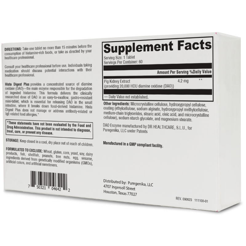 Hista Digest Plus provides a concentrated source of diamine oxidase (DAO)—the main enzyme responsible for the degradation of ingested histamine. This formula delivers the clinically researched dose of DAO in an easy-to-swallow, gastro-resistant mini-tablet, which is essential for releasing DAO in the small intestine, where it breaks down food-derived histamine. Hista Digest Plus does not manage or address antibody-related or IgE-related food allergies.